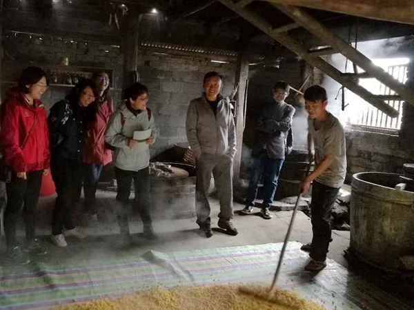 12日,调研组与黑土麦田工作人员来到扪岱村、合兴村、排吾村,走访当地苞谷烧酒坊、苗绣合作社、茶叶园等。