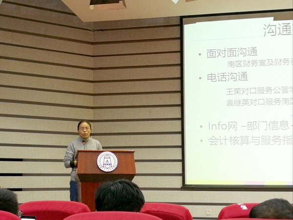 图为清华公管学院院长助理、财务主管慕玲作报告。