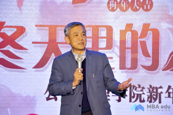 清华公管学院院长薛澜为大家带来新年致辞。薛澜表示,2017是难忘的一年,党的十九大召开,正式提出了习近平新时代中国特色社会主义思想,社会主义现代化建设进入了新时代。2017年,对于公管学院也具有同样重要的意义。学院在本科生第二学位和硕士生双学位项目中,在研究所的建设中以及其他方面都卓有成效,全体师生的共同努力让清华公管学院站在了国家公共管理学科的最前沿。薛澜同时强调,清华公管学院要向建设世界一流的公管学院的方向不断努力。2018年,清华公管学院将继续推进公共管理理论研究和实践探索,为国家治理体系和治理能力现代化贡献清华公管力量。薛澜最后祝愿老师同学院友们新年快乐。