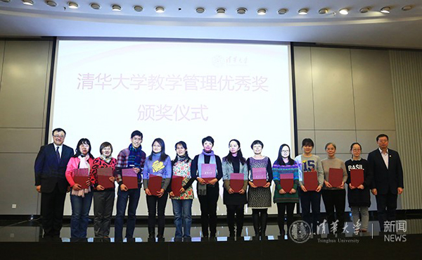 邱勇、杨斌与部分获奖的教学管理人员合影。图片源自清华大学新闻网。