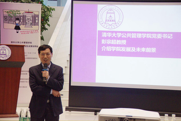 图为彭宗超介绍清华公管学院发展成就和前景。