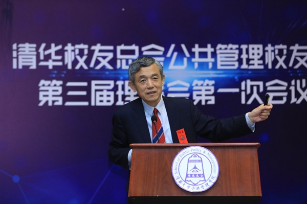 图为清华公管学院院长、清华公管校友会会长薛澜汇报学院情况。