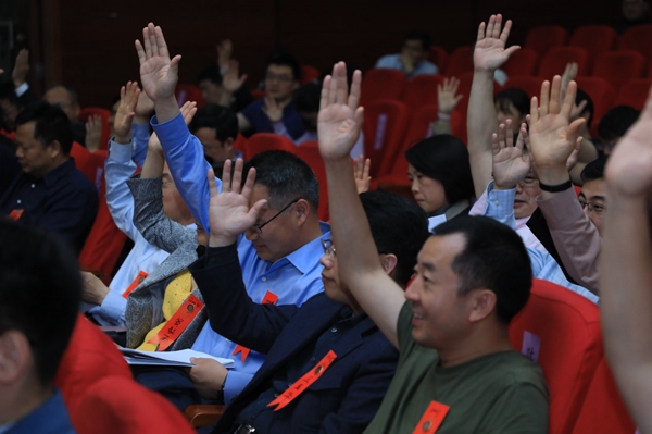 图为理事会成员举手表决理事会人员调整。