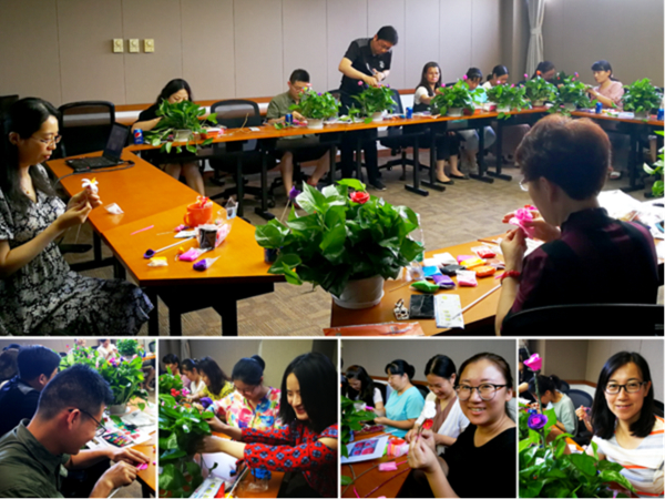 6月21日,学院分工会主席、党委副书记谢矜和分工会副主席吴延军老师与近30位学院员工一起,发挥想象和创意,包括男士在内的每位成员制作出了各种颜色鲜艳、形态各异的花卉盆景以及可爱的小饰品。在现场的欢声笑语中,不同部门的教职工借活动加强联系、交流了情感,同时收获亲手制作的漂亮盆景和一份愉悦的心情。
