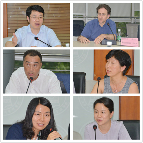 左一:王亚华,左二:Jér?me LACOUR,左三:常世彦,右一:Francois GREY,右二:章霁,右三:陆文静在会上发言