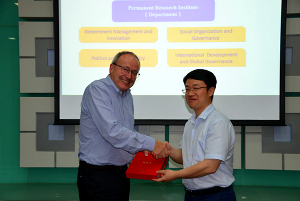 清华公管学院副院长王亚华向日内瓦大学副校长马克·特利斯科尼赠送清华大学礼品