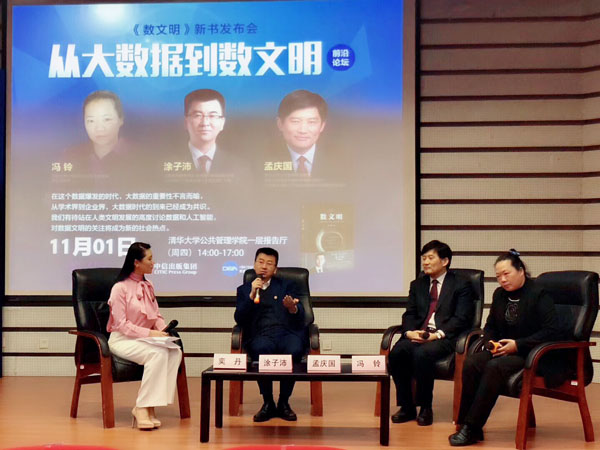 11月1日下午,由清华大学公共管理学院、中信出版集团和中国电子信息行业联合会数据与治理联盟联合举办的“从大数据到数文明前沿论坛暨《数文明》新书发布会”在清华大学公共管理学院报告厅举行。清华公管学院教授孟庆国与大数据先锋思想家涂子沛、清华大学计算机科学与技术系教授冯铃发表主旨演讲,共同探讨论了从大数据到数文明的衍生与发展问题。