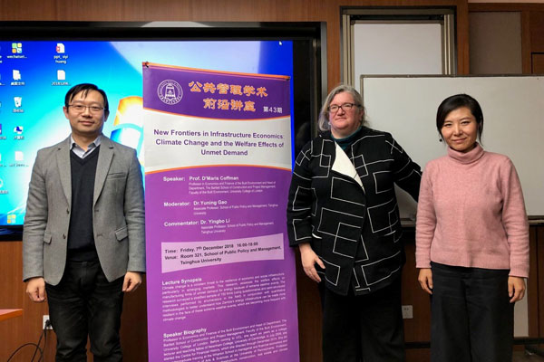 12月7日下午,公共管理学术前沿讲座第43期在清华大学公共管理学院举办。伦敦大学学院(University College London,简称UCL)巴特莱特建筑学院的D’MarisCoffman教授受邀发表了题为New Frontiers in Infrastructure Economics: Climate Change and the Welfare Effects of Unmet Demand的主题演讲,清华公管学院高宇宁副教授主持讲座,李应博副教授进行了点评。本期前沿讲座由清华公管学院国际发展与全球治理研究所承办,吸引了校内外师生共同参与交流与讨论。