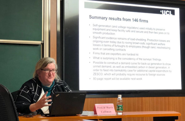 Coffman教授首先介绍了伦敦大学学院的发展历史、学院设置、师资力量以及优势特色学科项目的发展情况。随后,Coffman教授对其关注的气候变化经济学领域涉及到的主要议题进行了介绍,并以赞米比亚的电力危机作为案例,从案例选取的依据、研究动机、理论基础、研究设计、研究结果以及相应的政策建议和政策工具的使用等方面,分析了由于气候变化和厄尔尼诺现象导致赞米比亚灾难性的电力中断对制造业企业带来的影响。