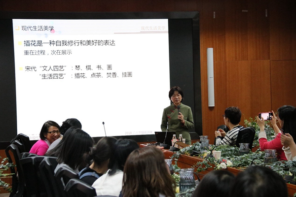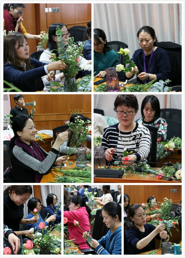 活动邀请了清华大学插花协会会长刘惠芬现场授课指导。活动开始,刘老师生动地讲解了:现代生活美学、以花为伴,生命的感悟、西方花艺等,指导女教工如何欣赏美、感受美和创造美。随后,专业花艺老师介绍了插花的技巧:花材保鲜与养护、花材的剪切、艺术造型要素和技巧手法。同时介绍了鲜花名称、特点并进行了现场演示和指导。女教工在花艺老师手把手的指导下亲自动手修枝剪叶,将原本普通的花草修剪、塑造出各种精美造型,创造出一瓶瓶精致的插花作品。活动现场弥漫着鲜花的香味,洋溢着欢声笑语,大家感受着自己动手制作“美丽”的快乐,享受着欢乐的插花时光,陶醉其中,不亦乐乎。