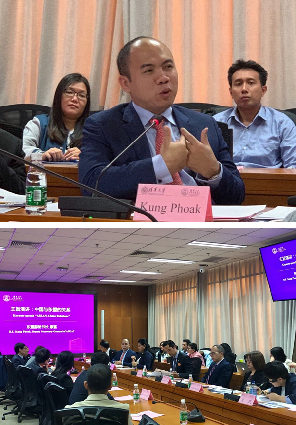 康富以“中国和东盟的关系”为题作主旨演讲。他指出,自东盟成立以来,其与中国的关系不断深化,双方共建的多个对话机制与合作平台蓬勃发展。他强调,双方在社会文化领域的合作更是日益密切,是推进中国-东盟战略伙伴关系进一步发展的重要内容。康富高度评价了清华大学在高等教育领域的贡献,期待在将来能有更多的双边人员往来和学术交流活动,希望从公管学院毕业的东盟成员国学生能成为中国和东盟之间的桥梁,推动区域合作和中国-东盟共同发展。