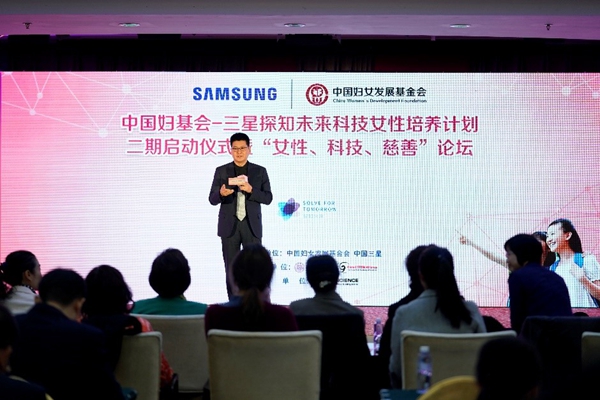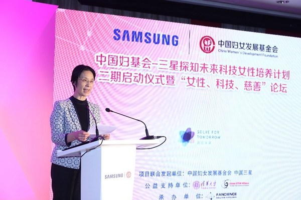 “探知未来科技女性培养计划”由中国妇女发展基金会与中国三星共同发起的,旨在通过引入国际先进的“STEM”教育理念(科学、技术、工程、数学等学科总称,鼓励用跨学科知识技能解决问题),培养12-16岁女性接受新科技、新技术的能力,鼓励她们灵活运用所学知识技能解决生活中的实际问题,从而提升科学教育对女性的影响力的公益项目,着力于为中国未来培育出更多具有创新能力、领导能力、敢于担当、自信自强的科技女性人才。