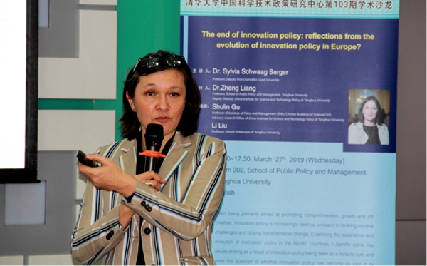 327日下午清华大学中国科技政策研究中心第103期学术沙龙在清华公管学院302会议室举行。瑞典隆德大学副校长、原国家创新署(VINNOVA)国家战略执行主任Sylvia Schwaag Serger 博士以“创新政策的终结?—基于欧洲创新政策演变的反思The end of innovation policy: reflections from the evolution of innovation policy in Europe?为题进行了演讲。