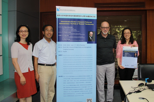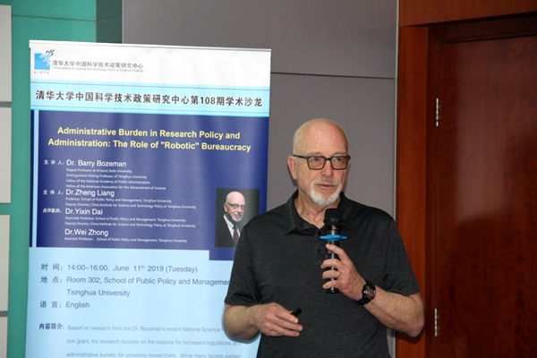 2019年6月11日下午,清华大学中国科技政策研究中心第108期学术沙龙在公共管理学院302会议室举行。国际知名公共管理与科技政策专家,美国亚利桑那州立大学公共管理和技术政策杰出校董教授,清华大学杰出访问教授,美国科学促进会会士,国家公共行政学院院士,法国科学院院士Barry Bozeman博士以“Administrative Burden in Research Policy and Administration: The Role of Robotic Bureaucracy”为题进行了演讲。