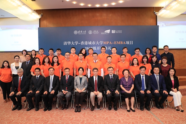 香港城市大学商学院助理院长俞伟峰、郝刚,清华大学国际合作与交流处副处长、港澳台办公室副主任杨庆梅,清华大学研究生院培养办公室主任孙傅,清华大学公共管理学院副院长朱旭峰、党委副书记谢矜、院长助理慕玲,以及首届MPA-EMBA项目学员等50余人出席开学典礼。