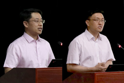 周绍杰(左一)、谢矜(右一)在党建专题中发言