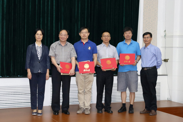 江小涓(左一)、彭宗超(右一)为部分教学获奖教师颁奖