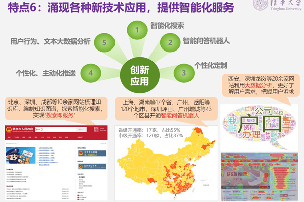 特点6:涌现各种新技术应用,提供智能化服务。一是北京、深圳、成都等10余家网站梳理知识库,编制知识图谱,探索智能化搜索,实现“搜索即服务”。二是上海、湖南等17个省,广州、岳阳等120个地市,深圳坪山、广州增城等43个区县开通智能问答机器人。三是西安、深圳龙岗等20余家网站利用大数据分析,更好了解用户需求,把握用户诉求。