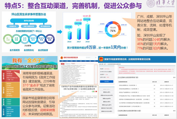 特点5:整合互动渠道,完善机制,促进公众参与。广州、成都、深圳坪山等网站地整合互动渠道,完善分发、流转、处理等机制,成效显著。湖南等地积极畅通渠道,引导网民为《政府工作报告》建言献策,2019年有37个“金点子”写进了湖南省政府工作报告。国家市场监督管理总局等网站加强制度建设,引导公众参与决策,征集活动均积极反馈,说明采纳情况,未采纳的说明原因。