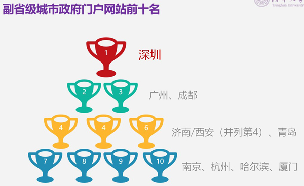副省级城市政府门户网站中,深圳、广州、成都位列前三名,济南/西安(并列第四)、青岛、南京、杭州、哈尔滨、厦门分列四至十名。