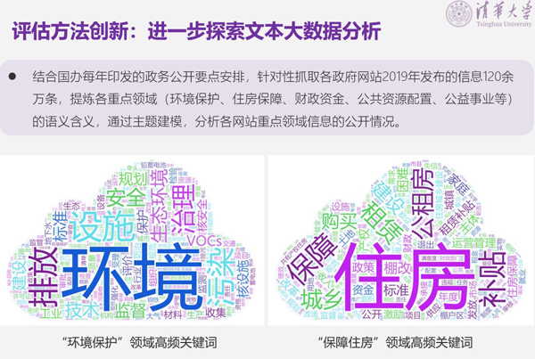 在开普云和2861智库的大力支持下,2019年评估中我们特别加强了大数据技术的应用,提高了对政府信息公开的深度和质量以及用户口碑情况的评估权重。结合国办每年印发的政务公开要点安排,针对性抓取各政府网站2019年发布的信息120余万条,提炼各重点领域(环境保护、住房保障、财政资金、公共资源配置、公益事业等)的语义含义,通过主题建模,分析各网站重点领域信息的公开情况。