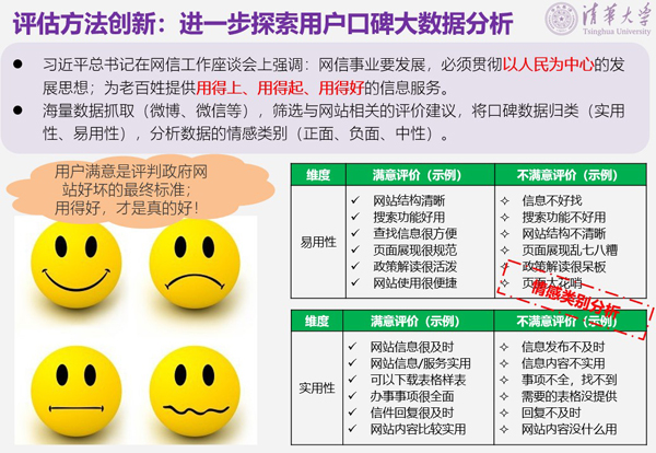 并且,进一步探索用户口碑大数据分析方法。通过海量数据抓取(微博、微信等),筛选与网站相关的评价建议,将口碑数据归类为实用性、易用性两个维度,分析数据的情感类别(正面、负面、中性)。
