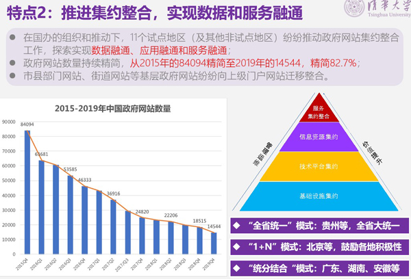 特点2:推进集约整合,实现数据和服务融通。在国办的组织和推动下,各地区纷纷推动政府网站集约整合工作,探索实现数据融通、应用融通和服务融通;政府网站数量持续精简,从2015年的84094精简至2019年的14544,精简82.7%;市县部门、街道等基层政府网站纷纷向上级门户网站迁移整合。