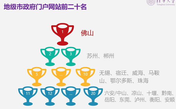 地级市政府门户网站中,佛山、苏州、郴州位列前三名,惠州、无锡、宿迁、威海、马鞍山、鄂尔多斯、珠海分列四至十名,六安/中山(并列第十一)、凉山、十堰、黔南、岳阳、东莞、泸州、衡阳、安顺分列十一至二十名。