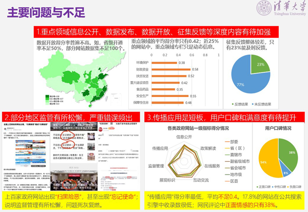 主要问题与不足表现在:一是重点领域信息公开、数据发布、数据开放、征集反馈等深度内容有待加强。数据开放得分率普遍不高。如,省级开通率不足50%,部分网站数据集不足100个;重点领域的平均得分率只有0.42,近25%的网站中,重点领域专栏只是动态信息;征集反馈整体较差,只有23%能及时反馈。二是部分地区监管有所松懈,上百家政府网站出现“扫黑险恶”,甚至出现“忘记使命”,应引起高度重视。三是传播应用是短板,用户口碑和满意度有待提升,“传播应用”得分率最低,平均不足0.4,17.8%的网站在公共搜索引擎中收录数很低,网民评论中正面情感的只有38%。