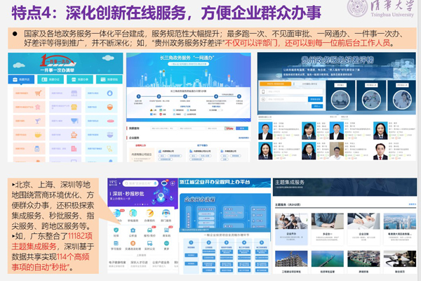 特点4:深化创新在线服务,方便企业群众办事。国家及各地政务服务一体化平台建成,服务规范性大幅提升;最多跑一次、不见面审批、一网通办、一件事一次办、好差评等得到推广,并不断深化。如“贵州政务服务好差评”不仅可以评部门,还可以具体到每一位前后台工作人员。北京、上海、深圳等地围绕营商环境优化、方便群众办事,还积极探索集成服务、秒批服务、指尖服务、跨地区服务等。广东整合了11182项主题集成服务,深圳基于数据共享实现114个高频事项的自动“秒批”。
