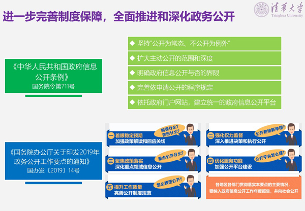 二是进一步完善制度保障,全面推进和深化政务公开。2019年4月发布了新修订的《中华人民共和国政府信息公开条例》(国令第711号),进一步扩大了政府信息主动公开的范围和深度,在此基础上要求加强政府门户网站等信息公开平台建设,以切实保障人民群众依法获取政府信息的权利。