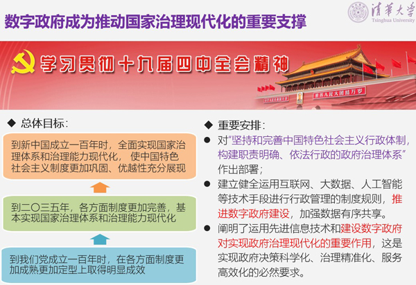 一是数字政府成为推动国家治理现代化的重要支撑。十九届四中全会的《决定》进一步对推动国家治理体系和治理能力现代化进行顶层设计和制度布局,明确提出要“建立健全运用互联网、大数据、人工智能等技术手段进行行政管理的制度规则,推进数字政府建设,加强数据有序共享”,阐明了运用先进信息技术和建设数字政府对实现政府治理现代化的重要作用,这是实现政府决策科学化、治理精准化、服务高效化的必然要求。政府网站应当发挥好“感知群众诉求的最先一公里”、“办成群众服务的最后一公里”,以及评价政府履职能力治理水平“风向标”和“晴雨表”的重要作用,不断提升人民群众对国家治理改革成果的获得感与满意度。