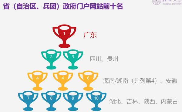 省(自治区)政府门户网站中,广东、四川、贵州位列前三名,海南和为湖南并列第四名,安徽、湖北、吉林、陕西、内蒙古位列六至十名。