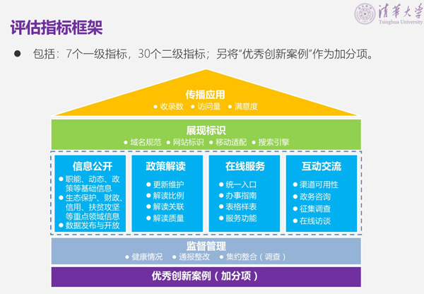 本次评估指标体系从内容、展现、保障和应用四个维度,设置了7个一级指标:信息公开、政策解读、在线服务、互动交流、展现标识、监督管理和传播应用。另外,为鼓励各地区各部门在新技术、新模式、新机制等方面的探索创新,推进政府网站集约化、智能化、实用化、规范化建设,评估过程中开展了优秀案例的征集工作,根据各地各部门政府网站主办单位推荐报送案例的质量给予适当加分。