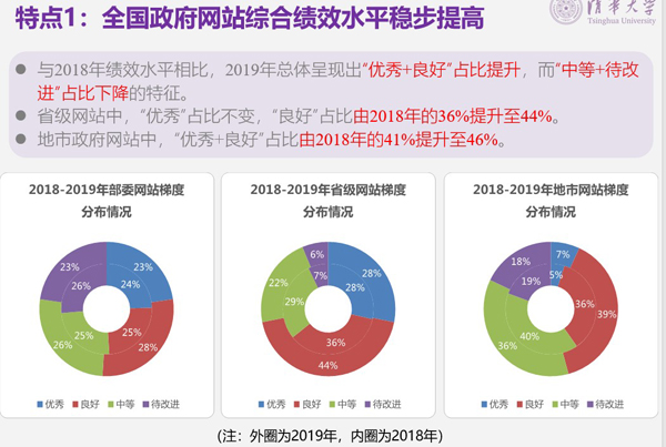 特点1:全国政府网站综合绩效水平稳步提高。与去年相比,2019年总体呈现出“优秀+良好”占比提升,而“中等+待改进”占比下降的特征。省级网站中,“优秀”占比不变,“良好”占比由36%提升至44%。地市政府网站中,“优秀+良好”占比由41%提升至46%。