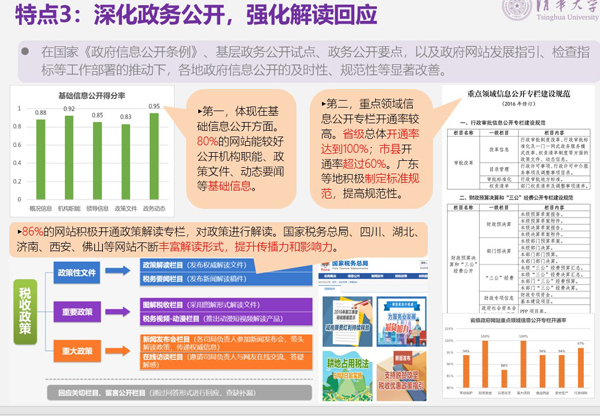特点3:深化政务公开,强化解读回应。一是80%的网站能较好公开机构职能、政策文件、动态要闻等基础信息。二是重点领域信息公开专栏开通率较高,省级总体开通率达到100%,市县开通率超过60%,广东等地积极制定标准规范,提高规范性。三是86%的网站积极开通政策解读专栏,对政策进行解读,国家税务总局、四川、湖北、济南、西安、佛山等网站不断丰富解读形式,提升传播力和影响力。