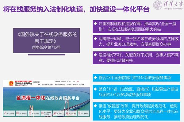 三是将在线服务纳入法制化轨道,加快建设一体化平台。2019年出台了《国务院关于在线政务服务的若干规定》(国令第716号),将在线政务服务建设发展纳入法治化轨道,为全国在线政务服务规范化、标准化、集约化建设指明了方向。十九届四中全会将推进全国一体化政务服务平台建设写入《决定》,将“创新行政管理和服务方式,加快推进全国一体化政务服务平台建设,健全强有力的行政执行系统,提高政府执行力和公信力”作为完善国家行政体制一项重要措施。2019年11月,全国一体化政务服务平台整体上线试运行,推进“放管服”改革,提升政务服务规范化便利化水平,我国又迈出了坚实的一步。