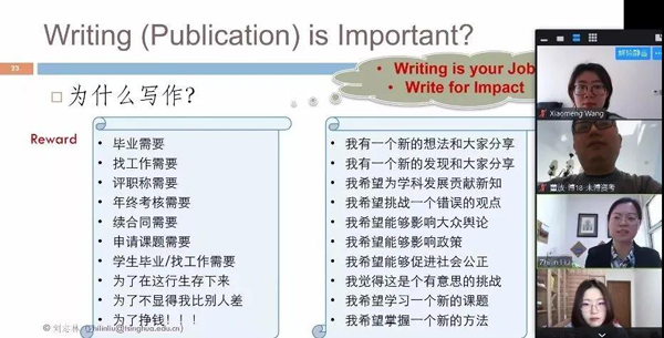 2019级硕士生赵旭:今天这节课老师主要介绍了论文写作与发表的一些事,让我们反思为什么要写作,讨论养成写作习惯的必要性等,跳出常规框架思考我们习以为常的论文写作。课程主要使用雨课堂与zoom,不知道是不是人少的原因,感觉zoom很流畅,没有任何卡顿情况。在网上大家针对某问题随时可以聊天交流,线上授课感觉比线下更利于同学们的交流讨论。同时,课上老师通过视频、提问、弹幕互动等方式,让人随时有参与感,有效保持了我听课的专注度和对问题的思考,线下反而做不到这一点。比较尴尬的是第一次使用zoom投屏,由于没提前操作,没能成功,下次要提前多尝试不同的功能。期待之后更多的课程!