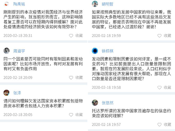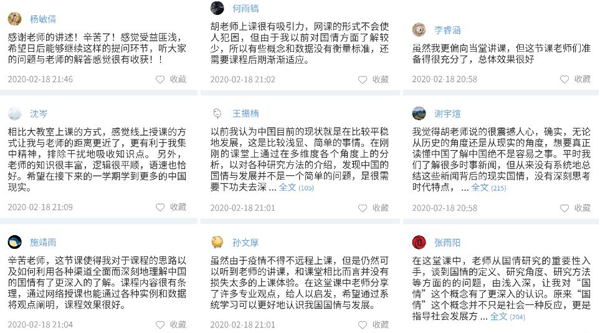虽然教学地点不再是熟悉的教室,线上教学却拓展了师生互动的边界,弹幕和投稿接连不断地涌向后台:“老师能在群里发一下书名吗?”“课堂投票的时间能否再多一些?”“未来的中国道路应该怎么走?”“如何回应西方的‘中国威胁论’?”“大一统体制能否从收益角度进行分析?”“举国体制如何克服难以区域合作的弊端?”……