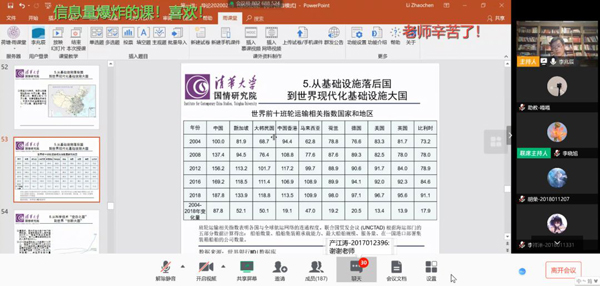 当然,不足之处也是有的。网络教学对网络速度和质量的要求都很高,留学生的课堂就充分反映出各个国家网络软硬件发展水平的巨大差异。有个别几个学生课上频繁掉线,即使在线声音和图像也不流畅,问答都比较困难。根本原因还是有些国家网络基础设施建设不足。由此更加理解“一带一路”部分沿线国家对基础设施建设投资的强烈渴望。