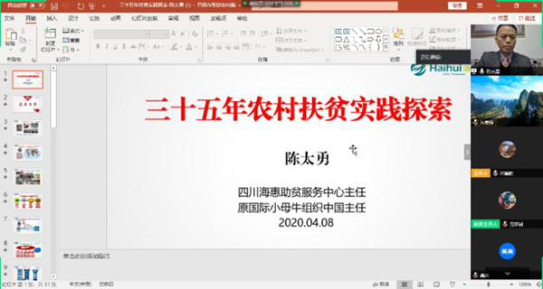 陈太勇首先从自己参与扶贫项目,结缘小母牛,并将公益扶贫作为终身事业的人生经历讲起;随后重点介绍了小母牛项目的扶贫实践探索和不断完善和升级的项目模式。小母牛项目经历了从1.0版畜牧发展、2.0版社区综合发展、3.0版助贫创福价值链、4.0版乡村产业一体化发展四个阶段,不同阶段有其不同的的特点。陈太勇特别强调了小母牛项目的特点,以价值为基础,注重以价值为基础、社区规划、项目主体的培养、资金物资投入和产业发展、项目的可持续性和后续监督管理等;接着陈太勇主任分享了简阳、云南澜沧下新寨、安徽省休宁县、河北围场社区、深圳和上海对口援疆、凉山昭觉社区、湖北天门等扶贫项目的成功范例,陈太勇最后指出,扶贫需聚焦乡村产业,生产销售并举,人才组织优先,整合多种资源,共建共享,同时离不开政府和企业的认可、认同与支持。