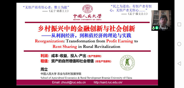 4月2日上午,清华社会创新与乡村振兴研究中心(以下简称“中心”)举办第七期学术沙龙,同时也是首次线上沙龙活动。中国人民大学农业与农村发展学院、国家社科基金专项“乡村振兴核心机制研究”首席专家周立教授应邀就“乡村振兴中的金融创新与社会创新——从利润经济到租值经济的理论与实践”主题进行分享。来自清华大学、中国社会科学院大学、中山大学、北京科技大学、北京体育大学、云南大学、湖南师范大学、湖南师范大学、青岛大学、安徽财经大学、太原学院等30多所高校师生以及中国人口福利基金会、北京益行者公益基金会、长治市纪委监委、中国交建、中国邮政、中规院、中国慈善家杂志等多家社会组织、政府、企事业单位工作人员及媒体人士等160多人参加沙龙。