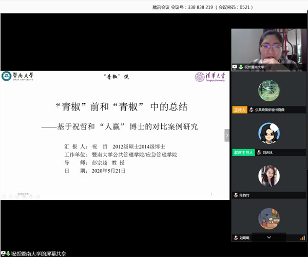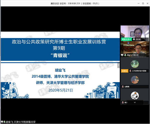5月21日,政治与公共政策研究所(以下简称“政治与公共政策所”)第九期博士生职业发展训练营活动通过腾讯会议在线成功举办。本期活动邀请到学院三位院友,现任天津大学管理与经济学部公共管理学院讲师胡业飞博士、复旦大学国际关系与公共事务学院青年副研究员周凌一博士和暨南大学公共管理/应急管理学院讲师祝哲博士作为嘉宾与大家分享求职经验和工作体会。活动由政治与公共政策所所长刘志林主持,学院研究生和博士后等70余人参加。
