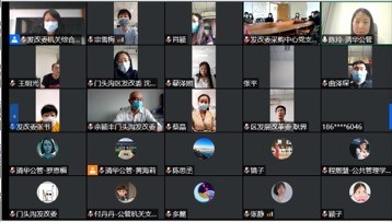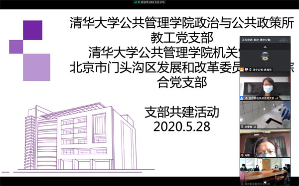 为创新基层党建工作载体,提高基层党建工作水平,进一步巩固“不忘初心、牢记使命”主题学习活动成果,5月28日下午,清华大学公共管理学院政治与公共政策所教工党支部(以下简称政策所教工党支部)与清华大学公共管理学院机关党支部、北京市门头沟区发展和改革委员会机关综合党支部以“防疫新常态下抓好复工复产”为主题举行支部云共建活动。活动由政策所教工党支部书记陈玲主持,三个支部共计超过70名党员参加。