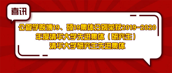 根据《清华大学研究生先进集体评选办法》有关规定,经院系推荐、资格审查、评审答辩、结果公示等环节,由2019~2020学年度第27次校务会议审议通过,清华大学公管学院博19集体荣获“清华大学先进集体(研究生)”称号。清华大学公管学院博19集体、硕19集体荣获“清华大学研究生先进集体”荣誉称号。