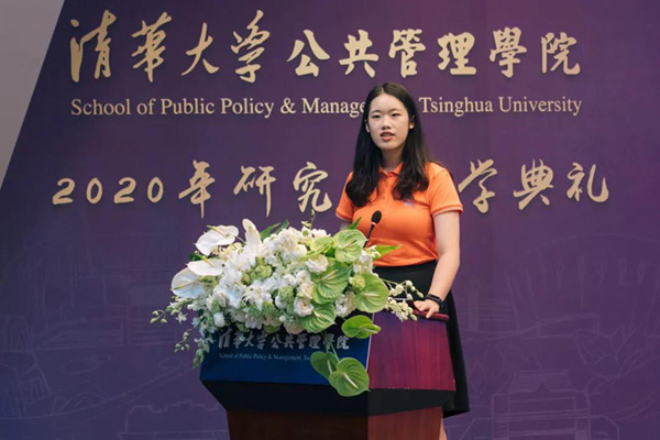 2020级中文项目新生代表朱一晨发言。朱一晨认为研究生阶段要厚植人民情怀之正气、树立家国胸怀之志气,培养放眼世界之勇气、锤炼敢为人先之锐气,追求脚踏实地之静气、铸就厚积薄发之底气,方能不负老师学校的期望。她希望与同学们一道砥砺德行,钻研学问,为中华强国之路建言献策;实事求是,行胜于言,用实际行动将“明德为公”的院训谱写在中国大地!在新的征程中,做一名无愧于国家,无悔于自己的清华公管人!