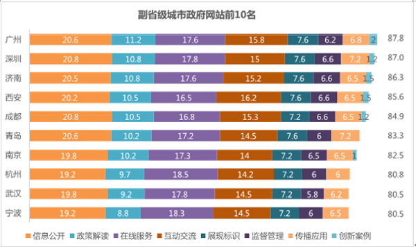 副省级城市政府门户网站中,广州、深圳、济南位列前三名,西安、成都、青岛、南京、杭州分列四至八名,武汉和宁波并列第九名。得分如下: