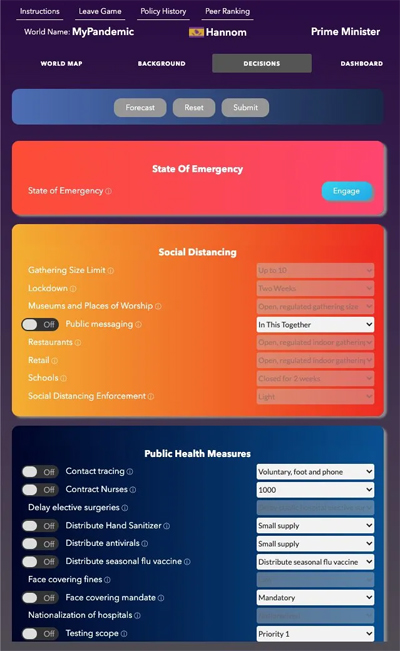 四支参赛队伍分别代表Chanmar、Gommolino、 Hannom、Malldaff四个虚拟国家,各队中的选手分别担任世界卫生组织代表、国家总理、公共卫生部长、财政部长、通讯部长的角色,从社交距离政策、公共卫生政策、经济发展政策、旅行限制措施等方面,根据财政预算、患病人数、死亡率、经济发展指标、民众支持率等数据,在不断发展变化的模拟疫情中,实时决定需要推行的各项具体措施,并综合考虑公共政策对各国和世界经济社会发展的影响,在复杂情景下快速做出科学决策应对全球公共卫生危机。