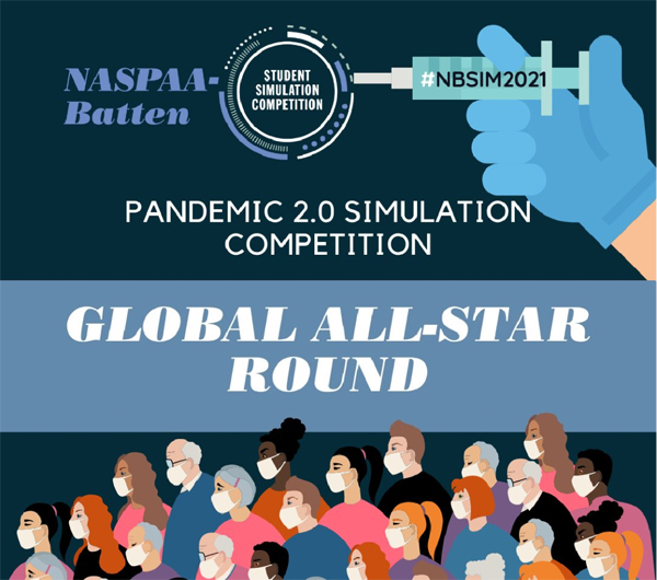 2021年NASPAA-Batten学生模拟大赛由全球公共政策、事务与管理院校联盟(NASPAA)和美国弗吉尼亚大学弗兰克·巴顿领导力与公共政策学院领导力模拟和竞赛中心(Center for Leadership Simulation and Gaming,UVA)共同发起,以应对全球流行病危机为主题。主办方基于真实数据开发了全球流行病仿真决策模拟软件,希望通过模拟大赛提高学生的创新能力、系统性思维能力和全球公共事务领导决策能力。在全球面临新冠肺炎疫情挑战的背景下举办此项赛事,对推动公共卫生领域的决策科学化和促进公共管理教育有着重要的意义。