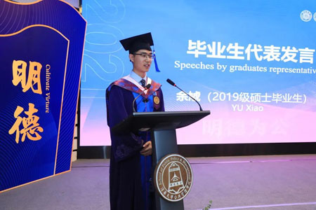 大家下午好,我是2019级硕士研究生余虓。六月盛夏,清华园再次迎来一年一度的毕业典礼。即将告别清华园,告别自己的学生时代,我与在座的各位同学一样,充满着留恋与不舍。
